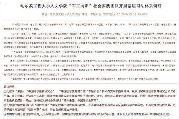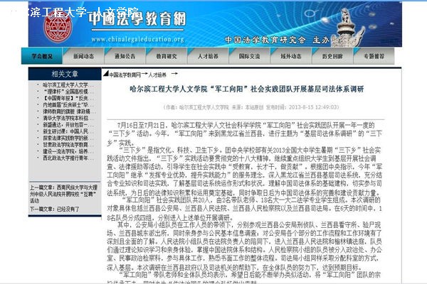 2013年8月15日,中国法学教育网“人才培养”版块发布新闻对BB贝博艾弗森官方网站“三下乡”社会实践活动进行了比较全面的介绍,在学界产生了一定的影响。