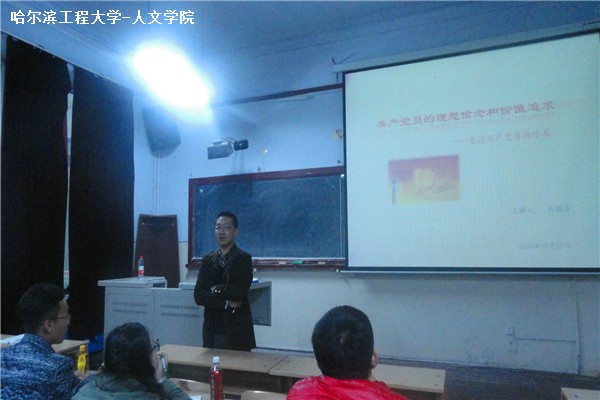 首先,刘振宇解释了“什么是社会主义,什么是共产主义”的基本问题,并且从中国近代的历史讲起,讲述了中国共产党拯救中国的伟大历史。接着他又着眼于现实,深刻剖析当代一些人丑化历史英雄的事例,使同学们深刻的认识到党课的重要性、深刻领悟到提高思想觉悟的紧迫性。随后,曹景杰从日常生活出发,从平常小事中透视当代一些人党性觉悟低,提醒同学们提高思想认识的紧迫性。最后,他又认真阐释了中国共产党的奋斗目标与中国梦,激励大家践行社会主义核心价值观。
