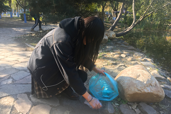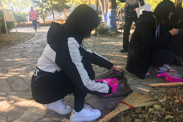 活动开始,志愿者们手持预先准备的清扫工具,到达指定位置;随后,志愿者们开始着手清理地面的枯叶,擦拭长椅,并徒手捡地上的枯枝;最后,志愿者们合影纪念。