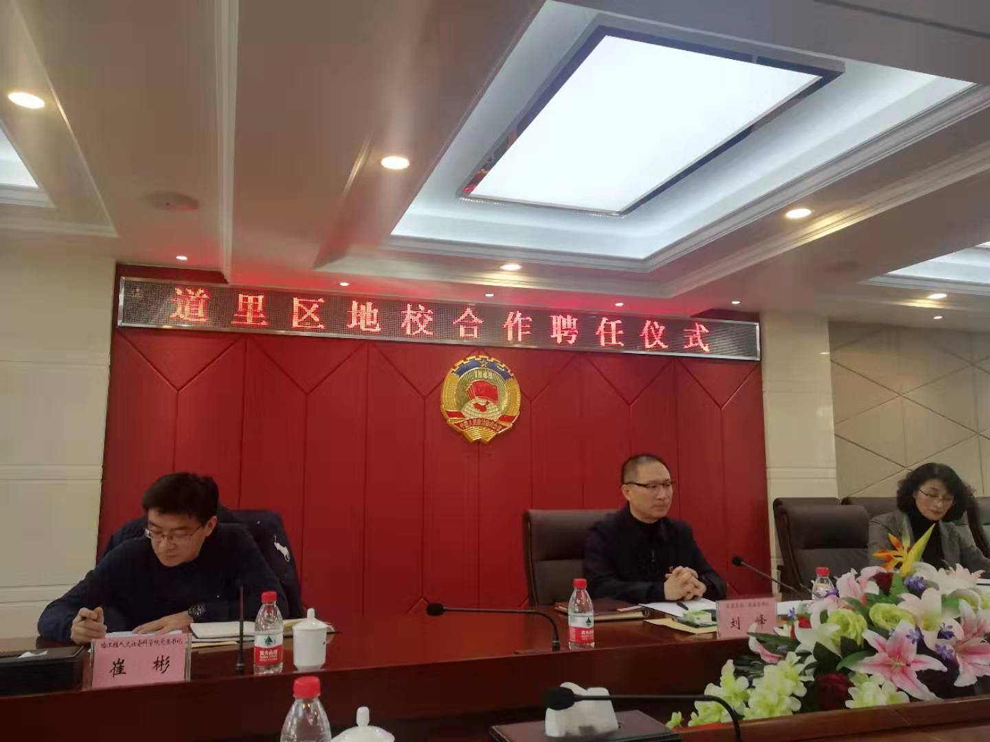 2019年11月28日上午,BB贝博艾弗森官方网站党委书记崔斌一行代表BB贝博官网参加了由哈尔滨市道里区政法委主持召开的地校合作座谈会,在会上签订了BB贝博艾弗森官方网站同道里区政法委新一轮地校合作协议。