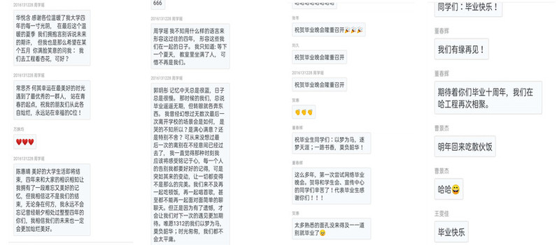晚会伊始,主持人们热情地欢迎各位观众的到来,屏幕中放映的开场视频引领着观众们思绪回到了那个紧张的冬日,视频后段画风一转,各种或温馨或搞怪的合照带来了无线的温馨与美好;第一个正式的节目,是20161311班全体同学们的美好回忆集锦,一张张明媚的笑脸,一个个熟悉的场景,那都是青春的模样,班主任情深意切的留言寄托着真切的爱与不舍,并且告诉大家“离别,是为了更好的相逢”;下一个节目是由姚楚和史姗姗带来的合唱节目《不为谁而作的歌》,美丽的少女伴随着天籁的嗓音,整个节目可谓引人入胜;接下来是乃古日伍日的吉他弹唱《送伍叔到2016年》,“愿你随风,一路平安”,这是他对毕业生简单而深切的祝福;然后是20161312班的集体视频和班主任寄语,“居之不倦,行之以终”,班主任的话充满勉励,将伴随学生们一路前行;下一首由原泉老师带来的《黑皮肤姑娘》,活泼可爱,异域风情的俄语歌曲给晚会带来了更多的欢乐与色彩;紧接着,院领导们也带来了他们的寄语,告别、祝福、激励就是各位校领导给予毕业生们的宝贵礼物;20161341班同学们的视频剪辑同样将无数美好的校园回忆分享给了在座各位,感动与欣喜永远不会过期,班主任说的那句“前程始霁”,也是对未来美好的期待;接下来,宋泽恩带来的《惠化洞》以及彭珊和刘拓带来的合唱《小幸运》让大家于美妙的音乐声中尽情地享受;20161342班同学们的剪辑也是一样的精彩,饱含留恋与不舍,“前途似海,来日方长”,班主任的寄语充满力量,引领着同学乘风破浪;再然后,家长代表讲话及社会学研究生们的寄语更是让晚会充满了深深的情意,不同的说辞,同样的韵味,都是美好的祝愿,都是深厚的情感;最后,晚会在全体主持人的集体诗朗诵中落下帷幕,一句“毕业快乐”,不是结束而是开始,人生的旅程会愈发精彩。