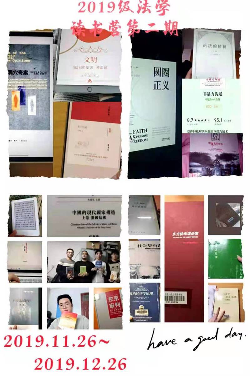 麦家说过:“读书的长度是需要锻炼的,当你每天多增加一点阅读量,你自然会习惯,你的人生就会慢慢变得厚实,你的内心就会变得生动、善良、细腻、美好。”法学党支部一直以立德树人为根本任务,为了不断提高法学专业的人才培养质量、加强学生的人文素养,于今年10月创建了读书营,号召学生们每个月读一本好书。学生们也积极响应,热情参与,展现了对于阅读的浓厚兴趣。