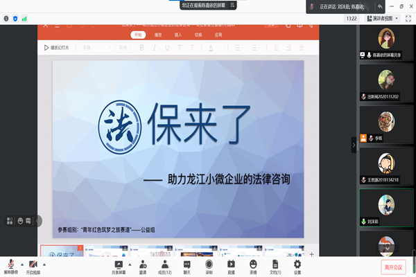 会议开始,由陈嘉依进行《法保来了—助力于龙江小微企业的法律咨询》模拟路演,项目讲解结束后,刘沫茹老师对参赛项目的ppt上的瑕疵提出改正建议,并强调了一些需要注意的细节。侯博文老师分析了黑龙江小微企业的现状环境,为项目的服务方向提出多样化的见解。曹景杰书记建议参赛人员继续优化项目结构;随后,王思源进行《识法务农—乡村法律纠纷分诊新模式》模拟路演,项目讲解结束后,赵岩老师就技术方面提出建议,曹景杰书记对项目的具体信息和收益分配以及结束方式提出了问题,侯博文老师就收益分配提出了解决办法。随后,孔天慧进行《矿嫂就业一体化帮扶项目》模拟路演,项目讲解结束后,各位老师对此项目进行了点评。最后,老师们就答辩环节对参赛人员提供有效的建议和指导,并对三个项目提出鼓励和期望。