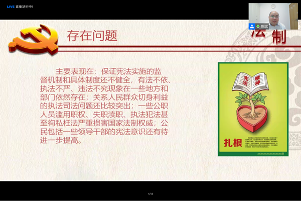 本次普法教育讲座主要分为四个部分。首先,陈斌介绍了宪法日的来历、设立目的及设立意义,并通过分析发生在身边的典型案例,引导参会人员主动思考目前我国在依法治国方面存在的一些问题。随后,陈斌依托当下网络发达、信息传播迅速的现状,以“网络并非法外之地,发表不当言论违法”为主题向大家介绍了不当言论的种类及相应惩罚措施。其中他特别强调了在疫情期间发表不当言论者将要承担不可避免的法律责任。接着,陈斌科普了关于毒品的法律知识,重点讲述了毒品对自身、家庭和社会的巨大负面影响,警示大家珍爱生命、远离毒品。最后,陈斌对大学生网络购物中常见的法律问题进行了深入浅出地分析,并在非法刷单、进口商品、代购、滥用退货权利等方面作了具体阐释,同时也向大家介绍了网购的相应维权办法。最后,陈斌耐心解答了同学们提出的问题,由李瑶宣布此次讲座结束。