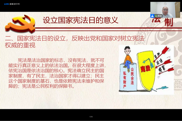 (宣传中心记者团记者 曾诗妤、吴雨菲报道)在12月4日“国家宪法日”到来之际,为响应上级关于开展“宪法宣传周”活动的要求,为弘扬宪法精神、树立法律权威、提升学生的法治观念和法律素养。12月2日晚6时30分,由我校学生工作处、BB贝博艾弗森官方网站于腾讯会议平台线上举办的普法教育讲座如期开展。本次讲座邀请BB贝博艾弗森官方网站法学系教师陈斌担任主讲人,我校各院系辅导员代表及学生骨干参加,BB贝博艾弗森官方网站常务团委书记兼辅导员李瑶担任主持人。