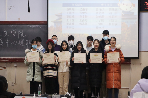 会议伊始宣传中心主席刘佳彬、副主席颜楚涵依次回顾了各自主要负责的工作,对宣传中心的工作成果进行了展示,并且列出了接下来的工作任务和目标。接着,宣传中心记者团、讲座策划部、视频采编部、视觉设计部、新媒体部的主要负责人依次从工作成果、工作不足和工作展望等方面对各自部门的工作情况进行了汇报。然后,刘佳彬公布了2021年度秋季学期宣传中心优秀工作人员名单,并为他们颁发了荣誉证书。随后,2021级优秀工作人员代表张唯琪和2020级优秀工作人员代表董昕瑶依次发表了过去一个学期的工作感想,表示会珍惜这一荣誉,并努力在以后的工作中取得更好的成绩。最后,宣传中心各工作负责人为大家分发了提前准备好的礼物,这份小礼物既包含了对大家过去一个学期工作的认可,也承载着对大家接下来工作的鼓励和希望。会议在温馨热烈的氛围中圆满结束,大家合影留念后有序离场。