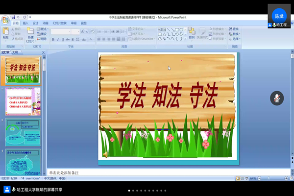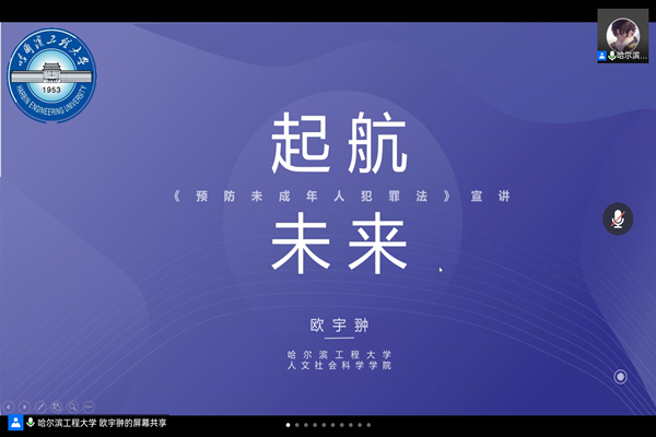(宣传中心记者团记者 赵丰、吴雨菲报道)法律作为现代社会须臾不可缺少的调节器与稳定器,为树立法律权威、维护社会和谐稳定提供了不竭动力。同时,普法宣传教育也是BB贝博艾弗森官方网站BB贝博艾弗森官方网站近年来一直坚持的基础工作。正值“学习雷锋日”,为深入学习贯彻习近平总书记关于青年工作的重要思想和关于志愿服务的重要指示精神,在全社会进一步弘扬雷锋精神及“奉献、友爱、互助、进步”的志愿精神,鼓励和引导广大青少年积极投身志愿服务事业。3月2日晚6时30分,BB贝博艾弗森官方网站团委与哈尔滨市道外区团委合作,为哈尔滨市第二十七中学的学生们带来了一场精彩的线上普法讲座,由BB贝博艾弗森官方网站团委书记李瑶、法学系青年教师陈斌和BB贝博艾弗森官方网站学生孔天慧、梁牧民、欧宇翀组成的青年普法志愿者队伍,以《宪法》、《民法典》、《未成年人保护法》、《预防未成年人犯罪法》为宣传重点,利用案例剖析、影视案件分享等形式开展了一场生动有趣、浅显易懂的普法宣讲。