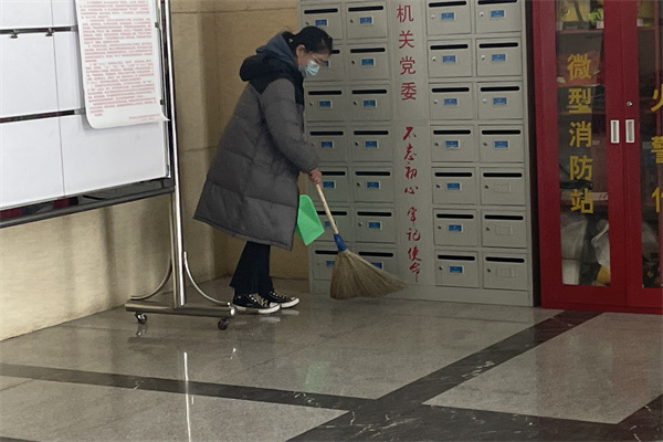活动开始前,志愿者们手持提前备好的清扫工具在主楼前集合,等待负责人分配任务;活动开始后,志愿者们根据任务安排对主楼大厅进行细致的打扫;随后,志愿者们互相检查清扫情况并对清扫成果加以完善;最后,志愿者们集体拍照留念。