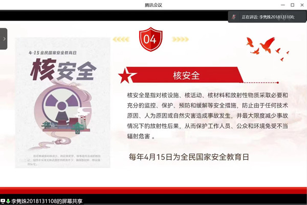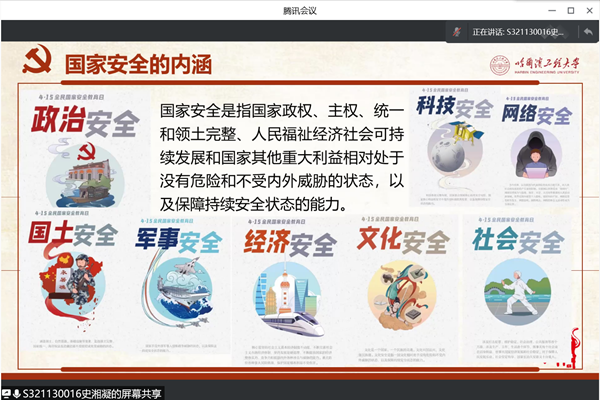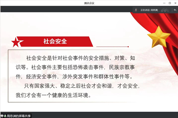 4月13日中午12时30分,本科法学第一党支部开展主题党课,由周思渊和李隽姝担任主讲人。首先,李隽姝介绍了国家安全教育日的由来;接着,周思渊讲解了国家安全中人民生活息息相关的文化安全和社会安全;随后,李隽姝讲解了科技安全,并重点强调了科技安全中的核安全和网络安全内容;最后,她指出维护国家安全是每个人应尽的义务,并呼吁大家重视国家安全教育,在日常生活中要用实际行动维护国家安全。