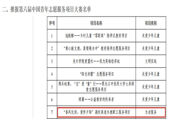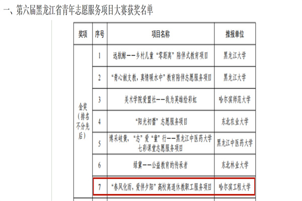 (宣传中心记者团记者 曾诗妤、吴雨菲报道)近日,由共青团黑龙江省委员会主办的第六届龙江青年志愿服务项目大赛成功落下帷幕。本次大赛采用线上评审的方式进行,经过各市(地)团委、各省管企业团委、各高校团委等单位组织推报,共138个项目参与评选,经过资格审查、材料初评、项目终评,最终角逐出金奖7个、银奖10个、铜奖10个、优秀项目奖11个。BB贝博官网师生在本次比赛中成功入围决赛,斩获优异成绩。