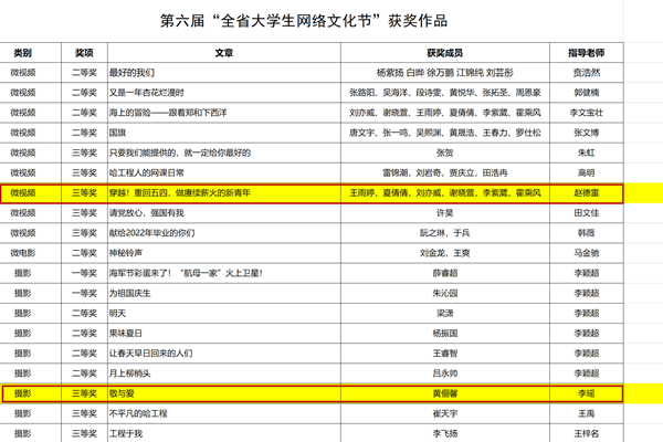(宣传中心记者团记者 曾诗妤、吴雨菲报道)近日,由教育部思想政治工作司、中央网信办网络社会工作局主办的“第六届全国大学生网络文化节”成功落下帷幕。活动自6月启动以来,我校共征集和投送218个网络思政教育领域的优秀作品,涉及网络文章、微电影、新媒体等类别。其中,49个作品获“黑龙江省大学生网络文化节”优秀作品奖。BB贝博官网师生积极参与,斩获佳绩。