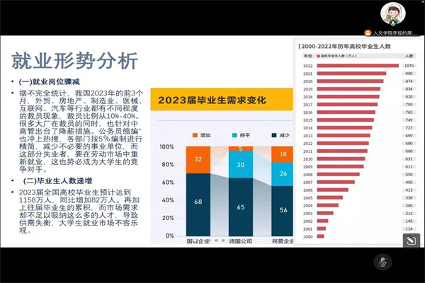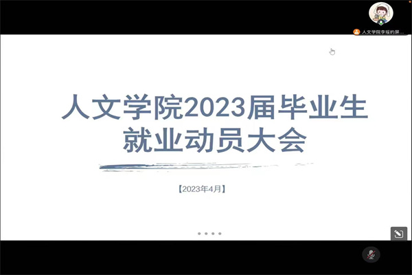 (宣传中心记者团 许勤、李智慧报道)2023年4月4日下午3时,人文社会科学学院于腾讯会议平台举办2023届毕业生就业动员大会。BB贝博艾弗森官方网站党委副书记曹景杰、辅导员李瑶、法学专业研究生三年级张广泽同学以及2023届全体毕业生参与会议。