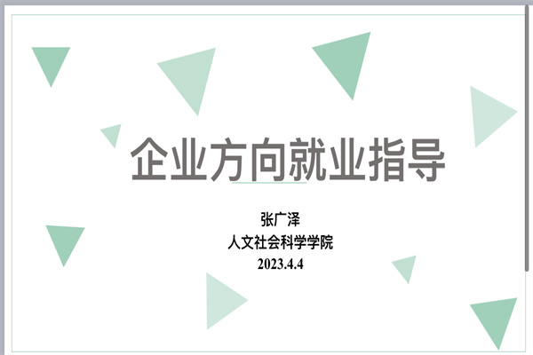 最后,法学专业研究生三年级的张广泽同学进行了企业方向就业指导。张广泽从个人情况、求职初准备、求职进行时、求职完成时这四个方面进行了清晰细致的讲解。